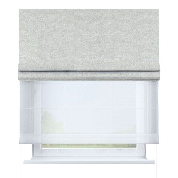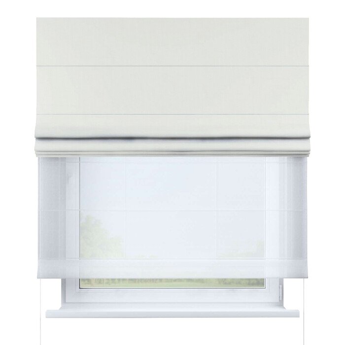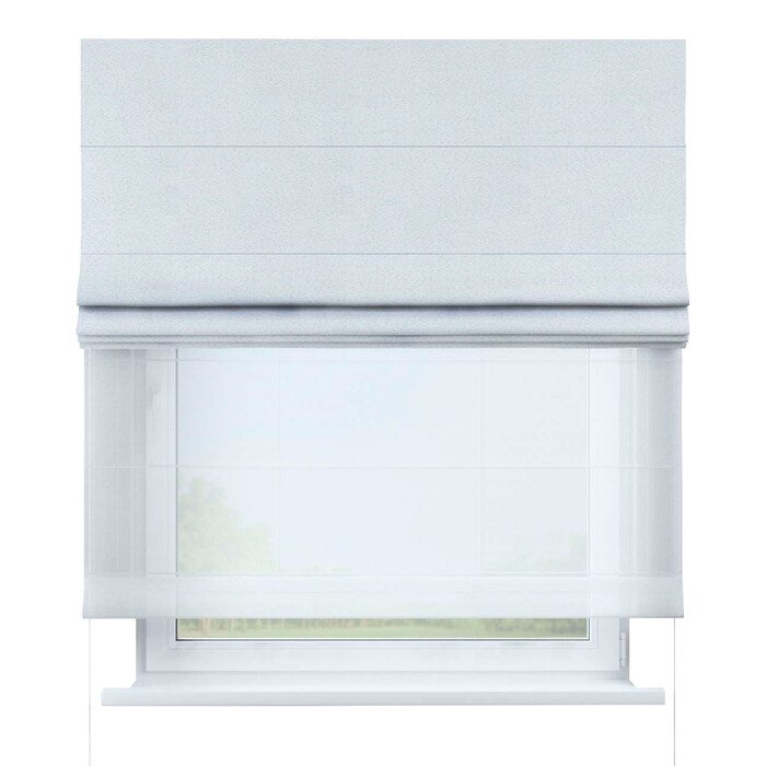 Римские шторы День-Ночь — система из двух отдельных полотен: полупрозрачный тюль для рассеянного света днем и плотная ткань (блэкаут) для затемнения ночью. Управление полотнами независимо друг от друга для максимальной регулировки освещенности и приватности.